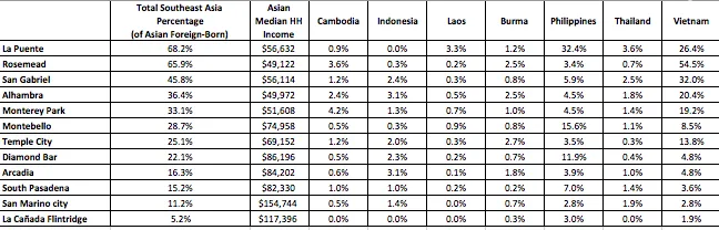 另一方面,东南亚人相对稀少。例如,尽管菲律宾人在整个县的亚洲移民中占有重要地位(23.1%),但他们在这三个东亚人口较多的郊区的外籍亚洲人口中所占比例较小:圣马力诺为2.8%,阿卡迪亚为3.9%,南帕萨迪纳为7.0%。