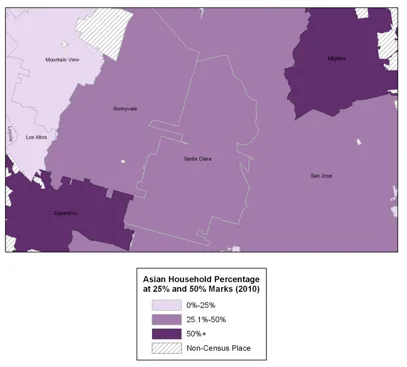 简单来说,我们在这里讲述的故事是明显的加利福尼亚故事,特定于南部的圣盖博谷和北部的硅谷。下图所示的后者地区(NBA明星林书豪的成长地)在过去三十年中经历了类似的大规模亚裔郊区化过程。