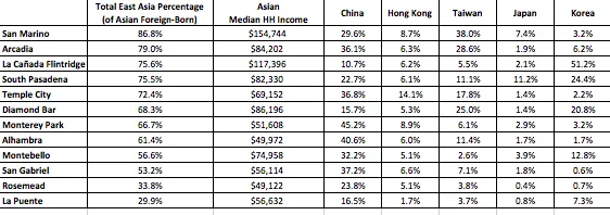 在圣加布里埃尔谷,亚洲亚群体的定居模式并非随机。在一些谷地郊区,来自东亚国家的移民亚洲人口比例远高于整个县的水平。例如,南帕萨迪纳、阿卡迪亚和圣马力诺的东亚外籍人口比例分别为75.5%、79%和86.8%。在这些郊区,台湾外籍人口与县的比例相比也显得不成比例,并且他们往往与更为集中的华人群体生活在一起。