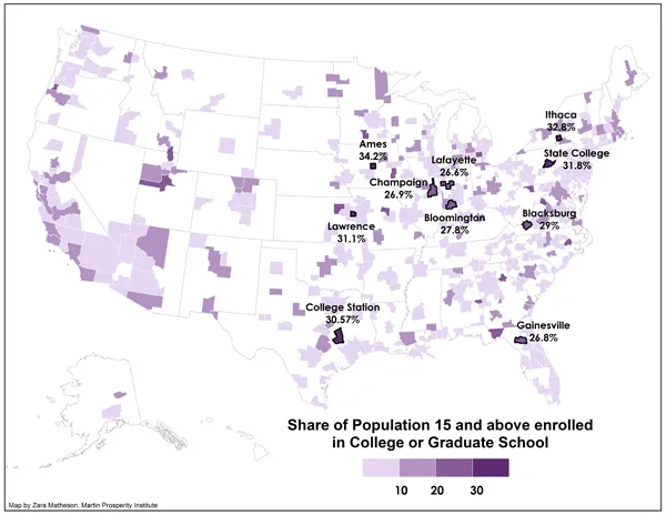 大学生比例最大的城市就像是大学城的名人录。爱荷华州的艾姆斯(Iowa State University的所在地)排名第一,大学生占其成年人口的34.2%。纽约的伊萨卡(康奈尔大学的所在地)排名第二,占32.8%。排名前五的还有宾夕法尼亚州的州立学院(Penn State University的所在地,31.8%)、堪萨斯州的劳伦斯(堪萨斯大学,31.1%)和德克萨斯州的大学站-布赖恩(德克萨斯农工大学,30.6%)。前十名的其他城市包括弗吉尼亚州的布莱克斯堡(弗吉尼亚理工大学,29.0%)、印第安纳州的布卢明顿(印第安纳大学,27.8%)、伊利诺伊州的香槟-厄巴纳(伊利诺伊大学,26.9%)和佛罗里达州的盖恩斯维尔(佛罗里达大学,26.8%)。