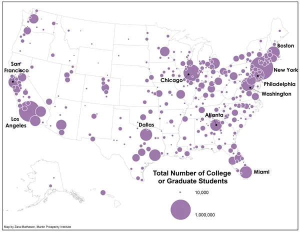 为了找出这些学生的集中地点,我的同事 凯文·斯托拉里克,马丁繁荣研究所的研究主任,分析了 美国人口普查局关于15岁及以上在私立大学、公立大学或研究生院注册的人的数据,基于2010年 美国社区调查的数据。MPI的 扎拉·马西森绘制了这些数据的地图。