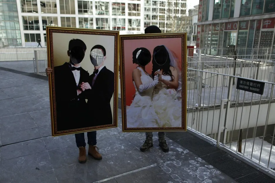 旁观者观看一位女性从北京一个艺术区墙壁上的人形空腔中走出。(大卫·格雷/路透社)