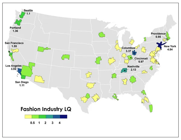 但接下来有一些惊喜。俄亥俄州的哥伦布排名第三。其高排名可能反映了其作为 Limited Brands 总部的地位,该公司是 Bath & Body Works、Victoria’s Secret 和 Henri Bendel 的母公司。纳什维尔排名第四。纳什维尔当然是 一个领先的音乐中心,音乐家与时尚长期以来一直有联系。地理学家 Brian Hracs 这样描述独立设计师与音乐家之间的关系 :