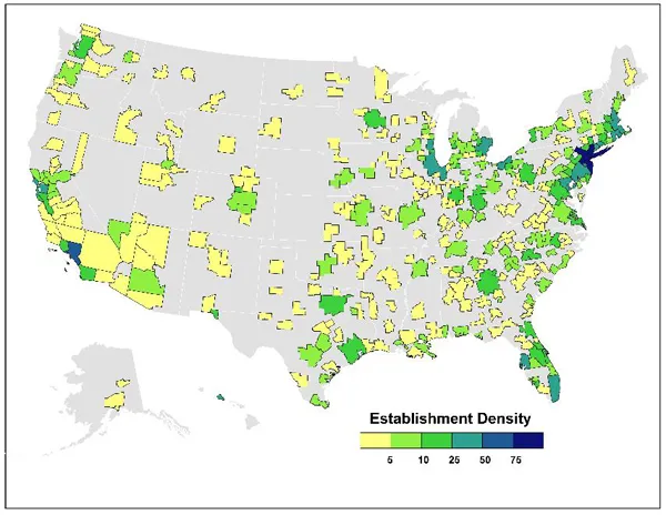 大纽约地区以每平方英里79个机构位居榜首。洛杉矶以68.7名列第二。两者的商业密度均超过全国平均水平的十倍以上。