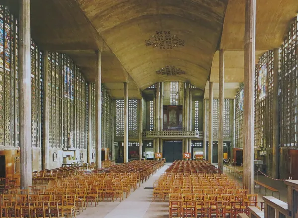 看看它的一些用途。书中有相当数量的照片是教堂的:勒·柯布西耶的 朗尚教堂、奥斯卡·尼迈耶的 巴西利亚大教堂、奥古斯特·佩雷的 雷昂西教堂(如上所示)。其他混凝土教堂在阿尔及尔、利物浦、雷克雅未克、东京、巴塞尔等地建造。还有原始的,罗马的万神殿。混凝土赋予神圣空间力量。