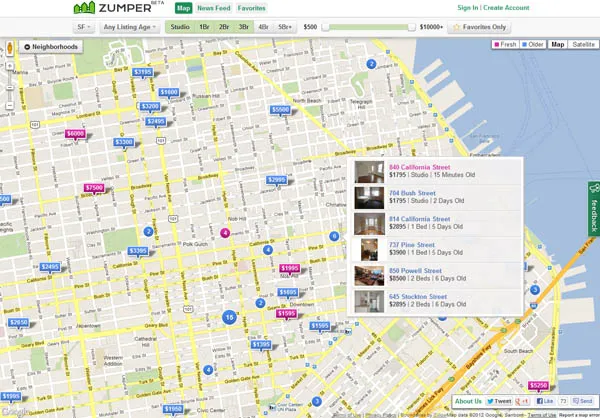 该网站目前仅在纽约或旧金山可用,已与房东和经纪人建立了合作关系,以便以易于地图和照片驱动的格式为找房者提供信息。你可以在房源的公寓照片和谷歌街景之间切换(我们认为这同样重要)。在缩小的视图中,房源按邻里集中分组。当你放大时,单个房源以可点击的价格气泡形式出现——对于搬到新城市的人来说,这尤其好,因为他们可能不知道太平洋高地的房源每月可达8500美元。