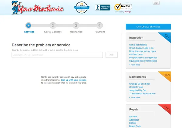 正如公司在其网站上所描述的:“把我们想象成汽车机械师的AAA。”你输入你的问题、汽车和联系信息,然后会匹配到一位持证机械师,他会到你那里。该网站有一个潜在汽车问题的下拉菜单(对驾驶恐惧症者应避免此菜单——列出的问题包括“关掉钥匙时汽车仍然在运行”或“踩油门时汽车熄火”)。目前仅在湾区提供服务,因此希望参加TechCrunch比赛能帮助他们扩展到其他地方。