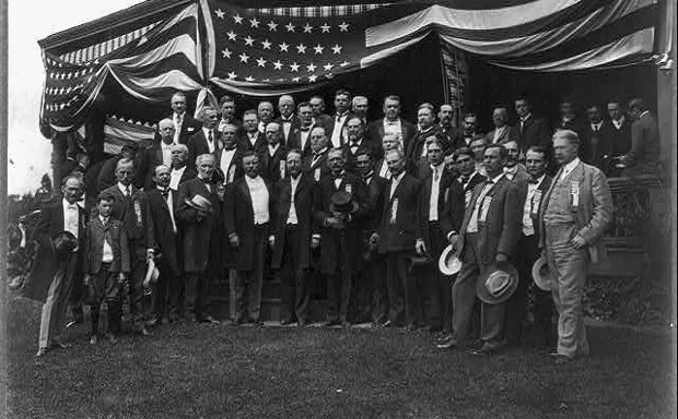 顶部图片:西奥多·罗斯福、约瑟夫·坎农、共和党提名委员会成员及客人在1904年纽约州牡蛎湾的萨加莫尔山前。哈里斯与尤因收藏,美国国会图书馆