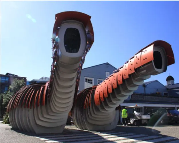 需要上厕所的人进入每个混凝土和钢铁动物的“嘴”以进入单个厕所。向上延伸的是一个像尾巴一样的隧道,带有错落的盔甲板,允许自然通风。建筑师表示,这些生物展示了“安全、卫生和防破坏等实际考虑”,我想,后者是指喷漆者可能担心尾巴会向下摆动并像虫子一样压扁他们?