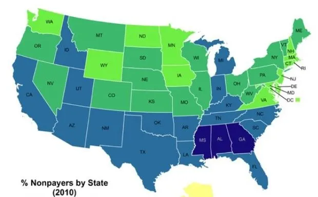三个州的非纳税人数超过40%——密西西比州(44.5%),其次是乔治亚州(42.5%)和阿拉巴马州(40.3%)——而这三州在2008年都坚定支持麦凯恩。其余的前十名大多位于阳光带:佛罗里达州(39.0%),阿肯色州(38.8%),南卡罗来纳州(38.8%),新墨西哥州(38.7%),爱达荷州(38.6%),德克萨斯州(38.5%)和犹他州(38.3%)。前十名中只有两个州——佛罗里达州和新墨西哥州——支持麦凯恩。在大约一半的州(26个州)中,至少三分之一的报税人是非纳税者。