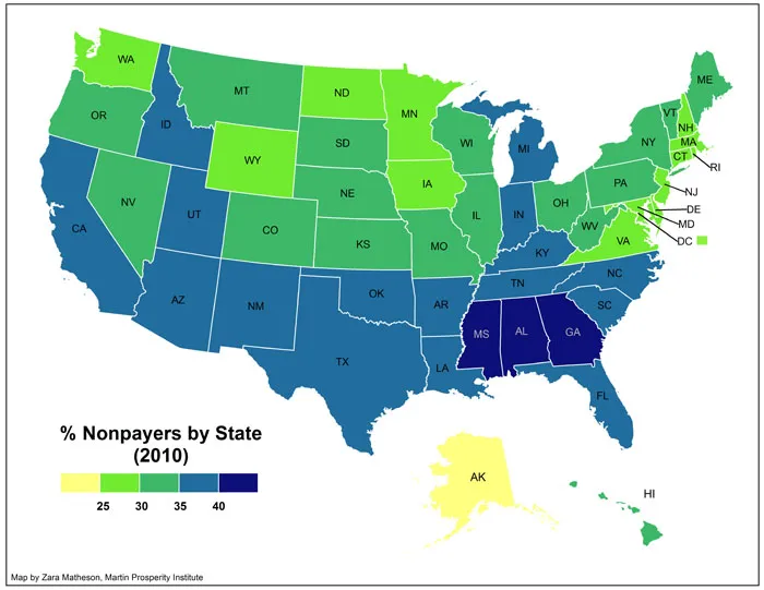 我认为更新地图并进行更多统计分析可能会很有用。 城市的同事 萨拉·约翰逊 找到了2010年关于“47%非纳税者”的数据,感谢 税收基金会,这是一个无党派的税收研究组织。(完整的2010年数据集可在 这里获取。) 马丁繁荣研究所的 扎拉·马西森 对数据进行了制图。