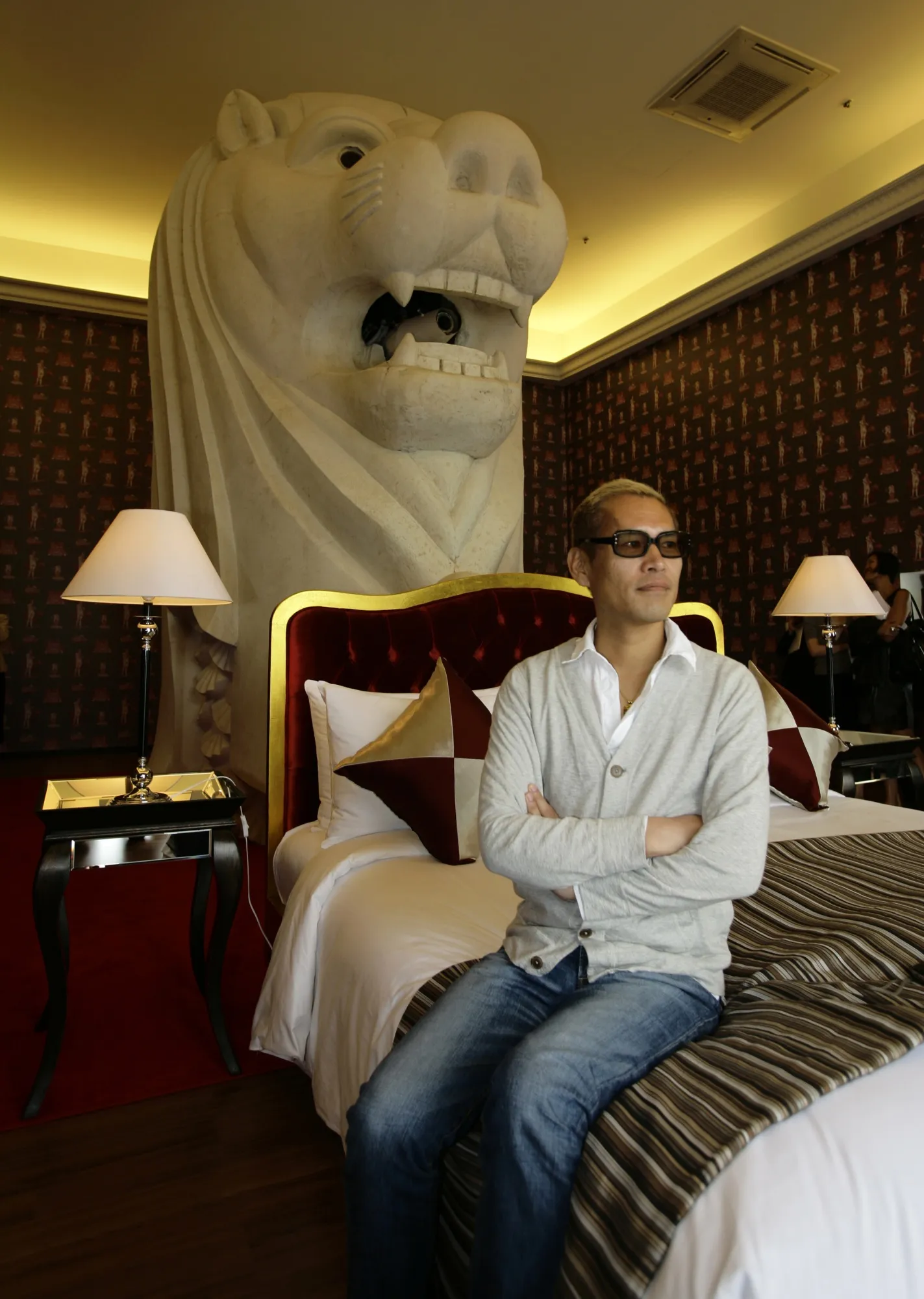 今天开放的“发现哥伦布”装置是公共艺术基金会最新的脑洞大开的项目(你可能还记得这个组织的中央公园的倒置飞机)。该组织在注意到Tatzu在世界其他地方为公共纪念碑建造的临时房间后,邀请他进行首次美国干预,例如在巴塞尔的一个豪华公寓,使用教堂的风向标作为咖啡桌道具,以及围绕新加坡的鱼狮喷泉的豪华酒店套房。这里是艺术家在那个超现实的休息室与喷泉的神话鱼狮合影: