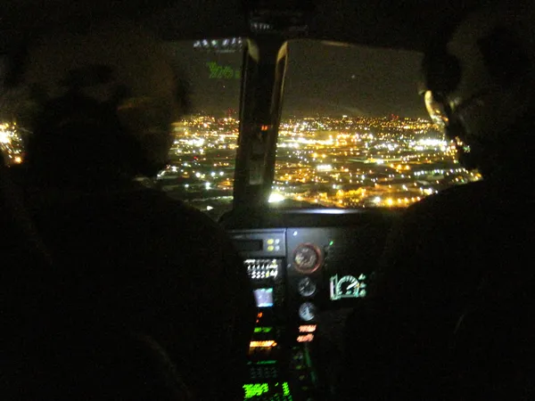 在达利的耳中,其他飞机在城市上空机动的声音响起。消防直升机在山坡上的火灾中工作。一架医疗直升机刚刚在儿童医院完成送货,正向西飞去。一架新闻直升机跟随在高速公路上因小事故而停滞的红灯模糊影像。进入该地区一个机场附近的空域引发了一场寻求空中交通塔许可的对话。他们彼此告知自己所在的位置和目的地,大家各自忙碌着。