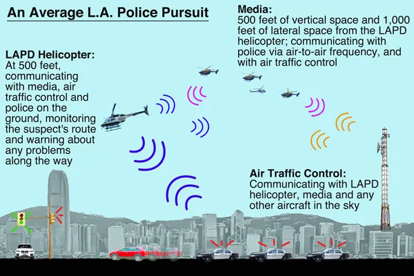 空中也可能存在危险。一架警用直升机和七架新闻直升机都在同一个移动目标周围飞行,空中事故的风险很高——并且可能致命。1966年,一架洛杉矶警察局的直升机与一架在道奇体育场附近的高速公路上报道交通的媒体直升机相撞,导致机上所有人员遇难。因此,联邦航空管理局建立了一个空对空通信频道,以便飞机共享位置和飞行路径信息。这个频率至今仍在使用。