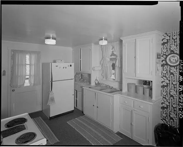 1930年代末诺维尔特,宾夕法尼亚州的一所房子的内部国会图书馆在1935年新定居点开放时,共提交了约1850份申请,争夺250个名额,许多申请者是被困在宾夕法尼亚州西部公司煤矿城镇的失业矿工。他们在诺维尔特建造的房屋坚固且设计良好,这在很大程度上要归功于第一夫人。罗斯福夫人与丈夫在自给自足者应有的住宿类型上存在分歧。他希望建造没有电和自来水的简陋小屋;而她和项目主任米尔本·威尔逊则主张提供现代设施,以帮助工人们提升生活水平。她和威尔逊赢得了这场斗争。