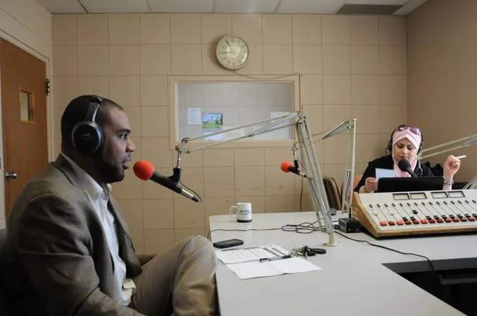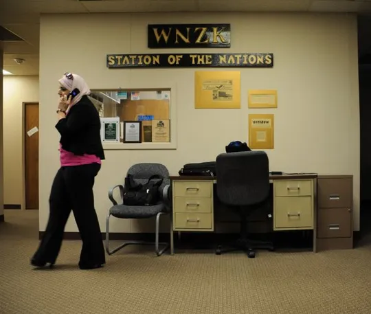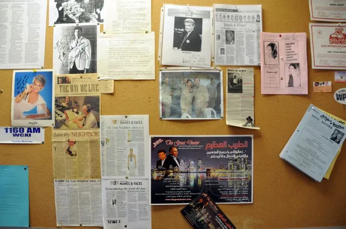 *执行董事达乌德·瓦利德在南菲尔德的电台 WNZK 690/680 AM。*莱拉·阿尔胡辛尼,一位叙利亚裔美国记者,主持《巴拉迪电台》和《早安密歇根》。密歇根美国伊斯兰关系委员会 (CAIR) 的公告栏,照片由佐伊·斯特劳斯拍摄“我真的把这个地球看作一个岛屿,居住着各种各样的人,”他以一贯的愉快和困惑的神态告诉我。“无论他们喜欢与否,大家都在一起。岛屿的概念有点和谐。但我也是科幻迷,”他说,提到1950年代的书籍和电影。“我喜欢当宇宙飞船离开地球并回头看时……有各种肤色和种族的科学家在工作,”并且“你意识到他们来自同一个星球。”