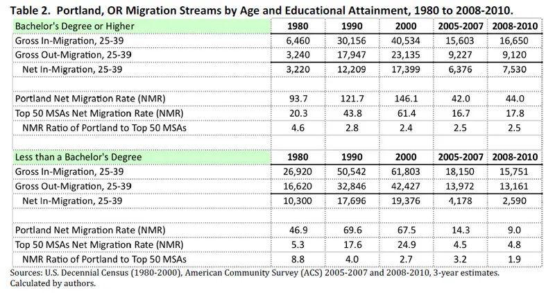 表格由研究“波特兰真的是年轻人退休的地方吗?”提供(PDF*)*在给我的一封电子邮件中,乔·科特赖特,一位驻波特兰的年轻人主要人口统计学家,指出:“令人惊讶的是,随着美国经济的疲软,受过良好教育的年轻人的净迁移实际上加速了。”