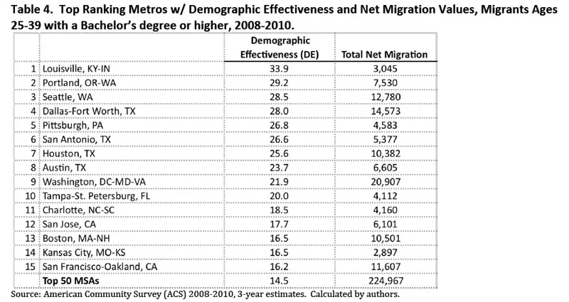 该研究依赖于一种称为“人口统计有效性”的指标来衡量大都市吸引和留住有才华年轻人的能力。下表来自该研究,显示自大萧条开始以来,美国50个最大都市在这一指标上的表现。波特兰在这一时期排名第二,仅次于路易斯维尔。