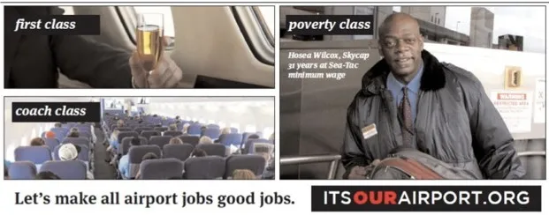 今年早些时候,在西雅图,全国性非营利联盟“工作华盛顿” 试图投放这个广告,呼吁在西雅图-塔科马机场提供“好工作”,在通往机场的中央普吉特海湾地区交通局轻轨线路上: