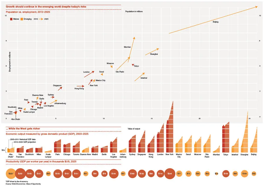 现在的情况大为不同。到2025年,按预计人口和就业人数计算,世界上最大的城市主要将位于金砖国家和新兴经济体。北京和上海领先,其次是孟买、东京、伊斯坦布尔、圣保罗和莫斯科。