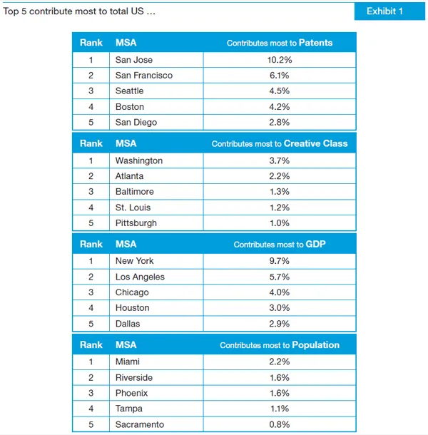 圣荷西(硅谷)在创新方面领先;华盛顿特区在对创意阶层的贡献方面领先(匹兹堡排名第五);纽约在对GDP的贡献方面领先,而迈阿密在对人口的贡献方面领先。
