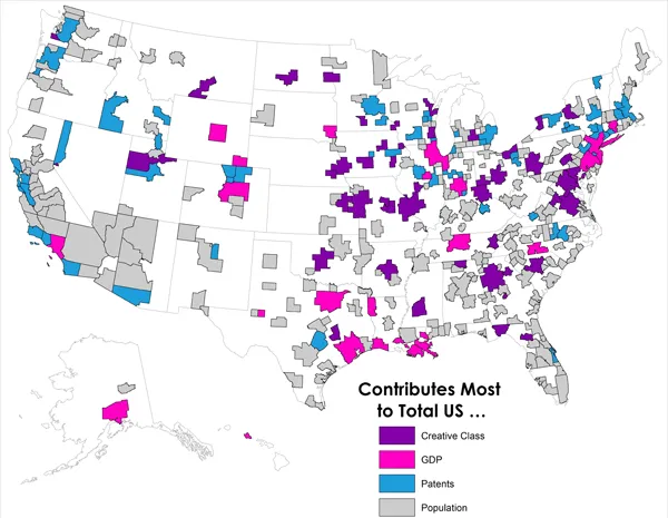 地图显示,这些小型人口城市(灰色)在许多情况下聚集在专利城市(蓝色)的边缘周围。还有那些对专利贡献最大份额的城市,聚集在GDP最高的城市周围。这在加利福尼亚、科罗拉多、伊利诺伊和纽约的部分地区得以体现,在这些地区,技术中心在大型人口和高GDP生成城市之外建立。