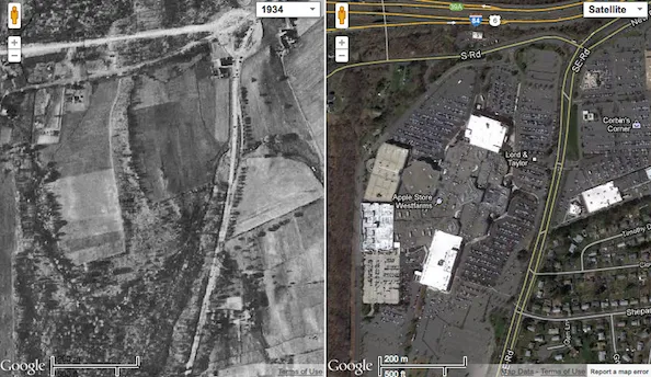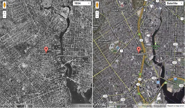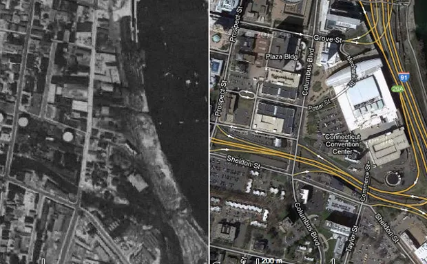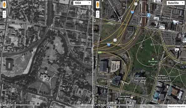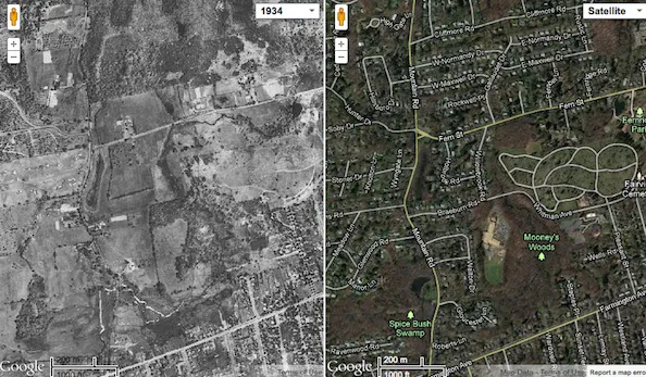 这些图像随后被数字化并拼接在一起。当它们与我们现代的对应物配对时,它们最为迷人:大约八十年后拍摄的谷歌卫星图像。康涅狄格大学图书馆与三一学院之间的一个项目,地图与地理信息中心(更恰当地说:魔法中心)为我们提供了一个机会,追溯这一变化的宏大故事。