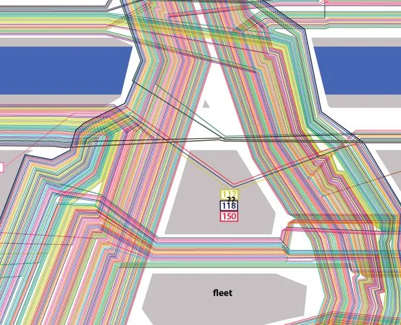 维内提基迪斯在尝试自己绘制地图时意识到这个系统是多么糟糕。他为每条当地公交路线画了一条线,将它们并排放置,沿着相似的走廊进入市中心。在一场最近的TED演讲中,他称这次初步绘图的结果为“一个漂亮的意大利面盘”。更确切地说,他可能会称之为一盘彩虹酱意大利面: