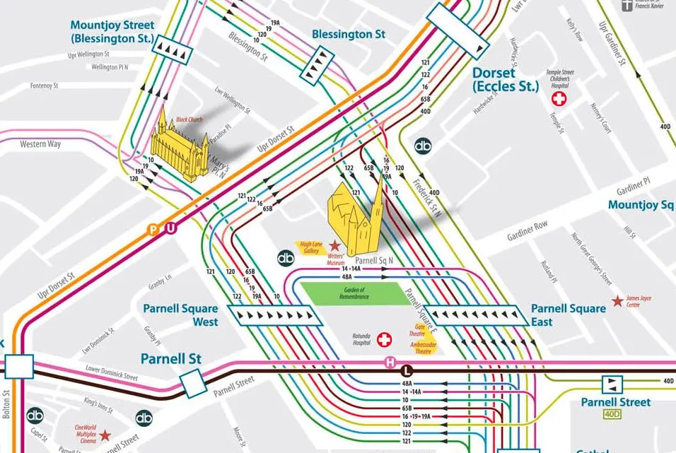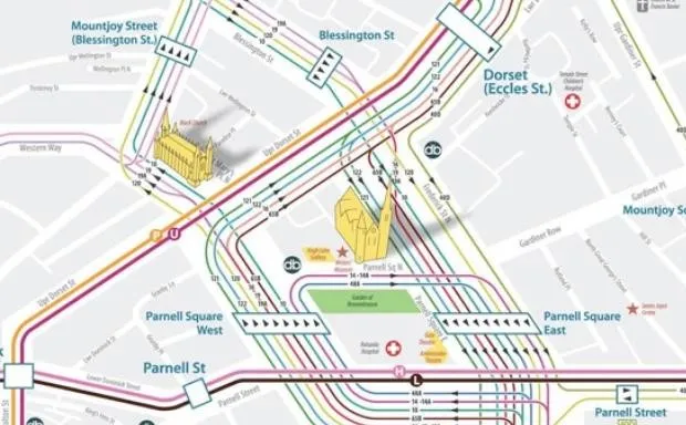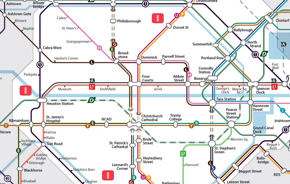 当平面设计师阿里斯·维内提基迪斯十多年前抵达都柏林时,他做的第一件事就是寻找一张公共交通地图,以帮助他探索这座城市。结果他发现了一团交通混乱。都柏林的公共交通系统主要由当地公交线路组成,这些线路并排运行,从郊区进入市中心。城市的地图上没有路线或车站名称。