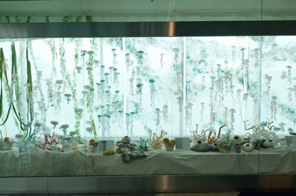 在延误期间冷静等待的空中旅行者可以与这个外来群体近距离接触,位于E航站楼的玻璃后面。这个水下场景是前波特兰居民、现居爱荷华市的Sayuri Sasaki Hemann的杰作,她对自然现象充满了兴趣(她的日常是“参观羊场”和“数兔子”)。自2009年以来,Hemann一直在用织物网制作胶质浮游生物,投入到她的项目中,以至于每种“物种”的水母都发展出了自己独特的个性。Flidais Desta是一种无色的底栖生物,依靠波特兰的细雨生存,而Ukko Calandra则以“焦虑和烦恼为食,反过来产生快乐和微笑。”