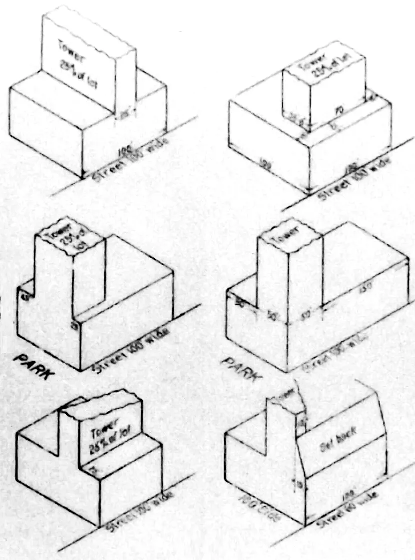 右侧插图:纽约建筑区委员会,纽约分区报告,1916年,通过维基媒体共享资源。