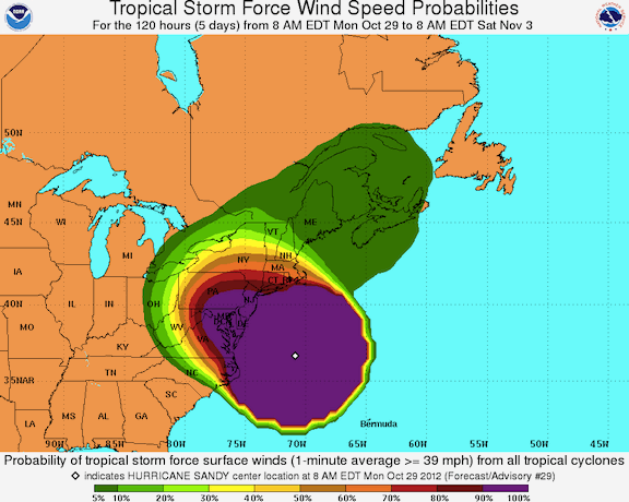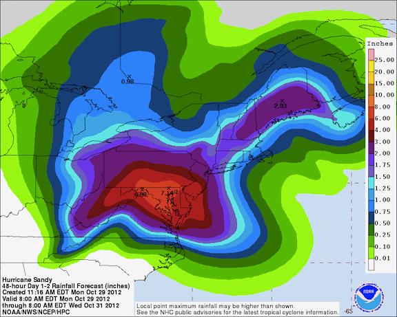 这是降雨预测,覆盖了桑迪登陆南部的东海岸: