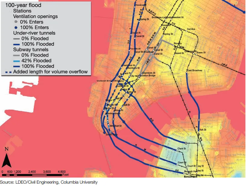 根据他们的模型,雅各布和同事们写道,百年风暴可能会导致大约10亿加仑的水需要从城市的地铁隧道网络中抽出。(为了让你了解规模,这相当于城市日常饮用水的平均消费量。)如果所有14条隧道都被淹没,报告称,清理每条隧道大约需要五天。然而,这只是最佳情况;每条隧道一周的时间更为可能。