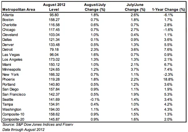 凯斯-希勒使用两种指标:10个城市和20个城市的20个主要美国大都市的综合数据。根据今天早上的最新报告,2012年8月与7月相比,两个综合的平均房价均上涨了0.9%。