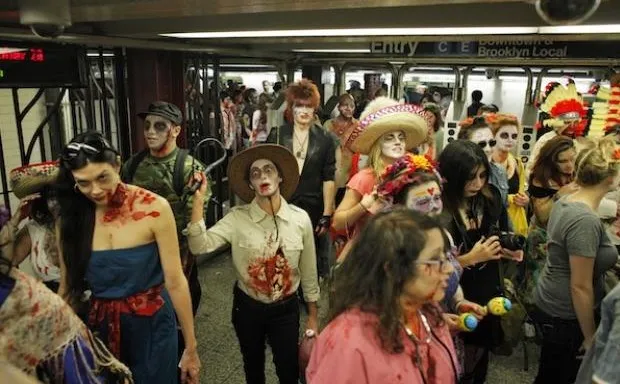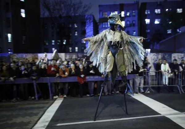 一位高跷表演者在2009年格林威治村的万圣节游行中穿着鸟类服装。Natalie Behring/万圣节顶部图片:人们打扮成僵尸在纽约地铁中走出,桑迪之前。(Eduardo Munoz/路透社)