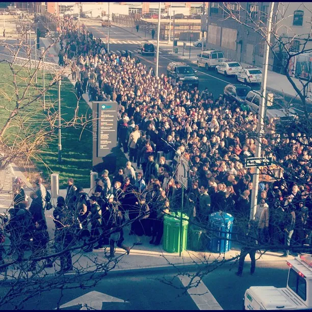 今天早上,推特用户 @virginialaird 捕捉到了 这张令人震惊的图片,是她窗外布鲁克林通勤者排队等候搭乘 前往曼哈顿的公交服务,这是城市本周为让工人们上岛而运行的服务,因为地铁隧道仍然被淹: