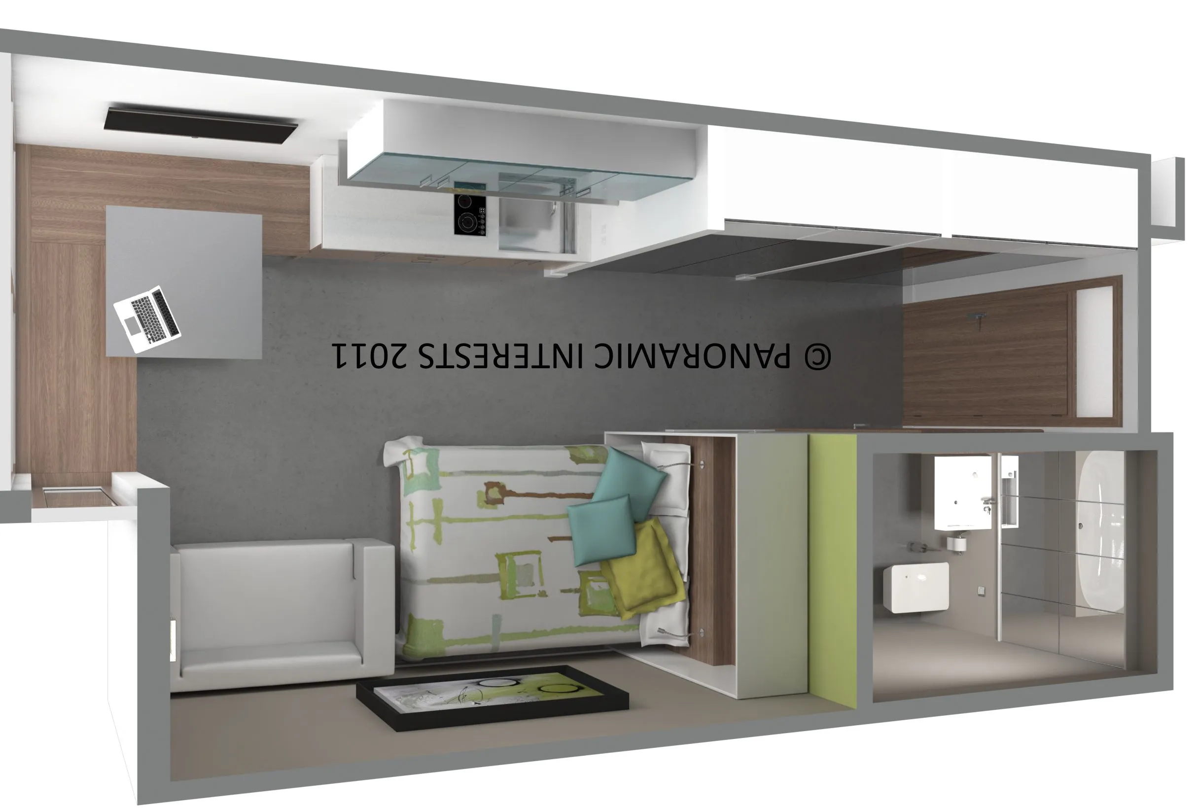 肯尼迪在设计一个吸引人的微型公寓时看到四个主要挑战。第一个是电视放在哪里,全景通过为每个单元配备一台平板电视来解决这个问题。
