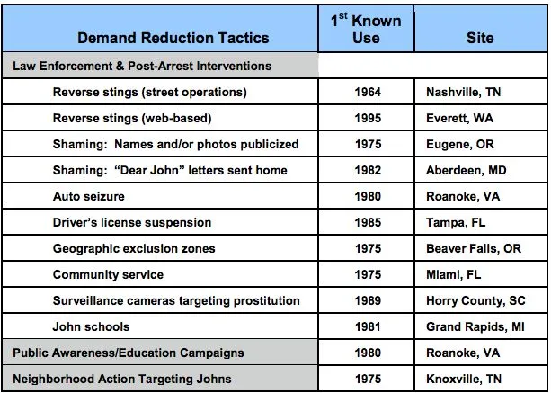 Shively表示,孤立的反嫖倡议可以追溯到20世纪初,但这一趋势在1970年代真正兴起,当时一些团体开始呼吁平等执行卖淫法。从那时起,出现了多种策略:从“反向诱捕”(女警察卧底招揽买家)到“嫖客学校”(旨在教育男性有关卖淫风险的项目)再到羞辱。Shively最新的司法部报告绘制了反需求的首批城市: