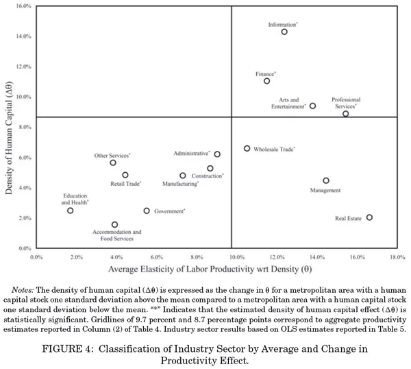 [T]我们论文中最有趣的发现是(1)在人力资本较低的大都市区,密度对生产力的影响几乎为零(甚至是负的),但在高学历比例的大都市区,密度对生产力的影响相当显著;(2)人口密度和大学学历对生产力的交互效应在信息、金融、艺术与娱乐以及专业服务等工业部门中最高——这些部门对创造力和思想共享有很高的要求。