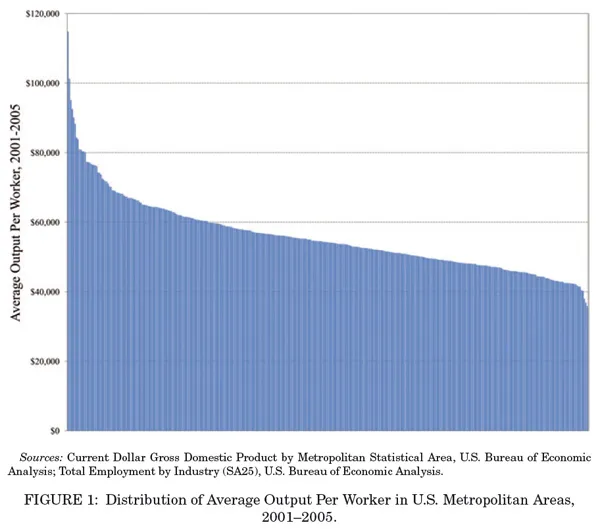 上面的图表来自该研究,显示了美国各大城市生产力的广泛差异。生产力最高的城市每位工人的平均产出为114,798美元,是生产力最低的城市(35,867美元)的三倍多。正如作者所指出的,“二十个生产力最高的城市每位工人的平均产出是二十个生产力最低的城市的两倍多,且比中位数城市的值大超过一半……”