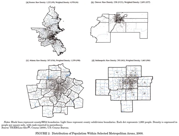 "[这些地图] 真的显示了差异(尤其是像丹佛这样的地方)在 ‘标准’ 密度测量(每平方英里的人口)和加权密度测量之间," Gabe 在一封电子邮件中写道。这是我们 最近在 城市 上探讨的一个概念。