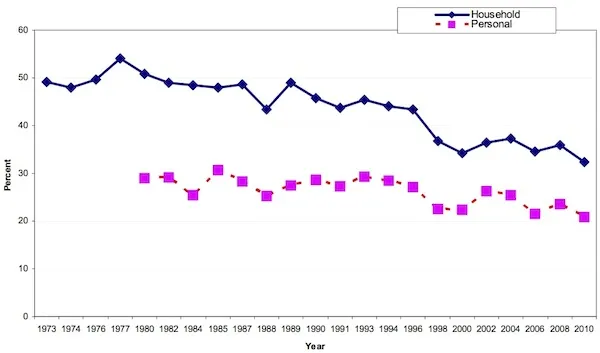 在同一时期,美国家庭持枪率从1970年代初期近一半的家庭表示拥有枪支下降到今天接近30%的水平。该图表基于一般社会调查数据,来自一份报告[PDF],由暴力政策中心发布于去年。
