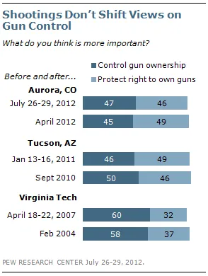 所有这些趋势——在枪支拥有、公众情绪、总体暴力、以及大规模杀戮造成的惨状——将在即将到来的关于下一步该做什么的辩论中汇聚。皮尤研究中心追踪了美国人对枪支态度在较短时间内的变化。皮尤在过去三次臭名昭著的大规模枪击事件之前和之后对美国人进行了关于枪支管制的调查,分别是在弗吉尼亚理工大学、亚利桑那州图森和科罗拉多州奥罗拉,正是在今年早些时候。他们的结论?