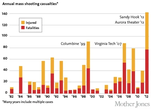 我们尚未看到一张图表,绘制出像纽敦那样的大规模枪击事件在同一时间框架内的增加频率,尽管数据确实支持这一点。正如布拉德·普鲁默在华盛顿邮报上所写,12起美国历史上最致命的枪击事件中有一半发生在过去五年。在过去30年中,母亲琼斯统计了62起大规模枪击事件,其中在最近几年中似乎发生了特别昂贵的一波: