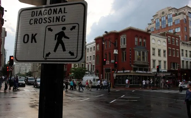 到目前为止一切顺利,华盛顿特区交通局的行人协调员乔治·布兰扬说,他称这个过街为“增强版巴恩斯舞”。与经典的混乱不同,该地区允许行人在绿灯时与交通一起行走,并通过禁止转弯来保护他们免受冲突。布兰扬说,交叉口可能失去了一些车辆容量,但这是一个小代价 — 尤其考虑到该交叉口的行人(每天30,000人)比汽车(27,000辆)还要多。