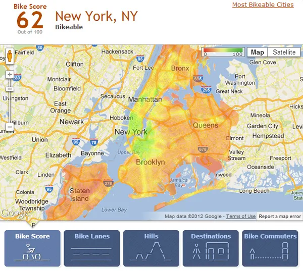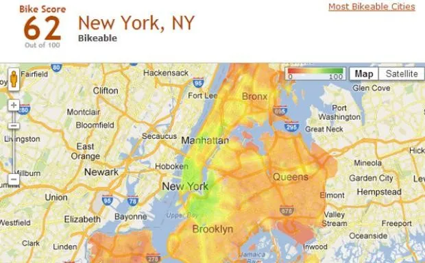 纽约市的自行车评分地图。(感谢 Walk Score)