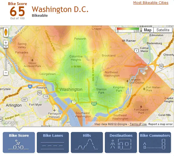 *华盛顿特区,骑行评分地图。(来自 Walk Score)*这是纽约的自行车评分地图。