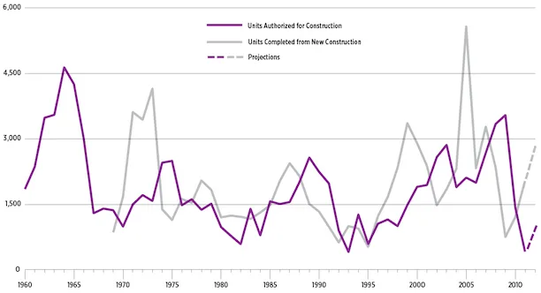 SPUR在一份新分析中记录了这一繁荣的诞生,分析表明,城市可能在未来几年内面临前所未有的建设速度,经历了特别深的低谷(请注意下面报告中的图表,城市的新住房建设通常在新许可活动激增后的三到五年内跟随)。