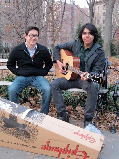 阿德里安与卡洛斯卡洛斯:“我们认识了16年,今天我们买了这把吉他。这是我们的假期愿望。我们每人出50美元。”