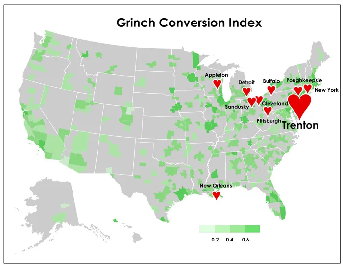 在最近的一份 报告 [PDF]中,我的同事们在 马丁繁荣研究所 对适合“转变格林奇”的城市进行了评级和排名,换句话说,就是那些具有能够让即使是最强硬的假日快乐厌恶者也能变成快乐好人的人口特征的现实威胡。